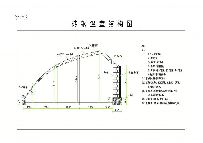 1.溫室:對(duì)新建集中連片且占地面積在500—2000畝(含2000畝)的溫室,按凈面積每畝給予補(bǔ)貼3.0萬(wàn)元,建設(shè)標(biāo)準(zhǔn)要符合溫室建造結(jié)構(gòu)要求(見(jiàn)附件1或附件2);新建集中連片且占地面積在2000畝以上的,采取“一事一議”的辦法;新華鎮(zhèn)萬(wàn)畝無(wú)公害韭菜種植基地新建或改建韭菜溫室集中連片且占地面積在200畝以上的,按凈面積每畝補(bǔ)貼2萬(wàn)元,建設(shè)標(biāo)準(zhǔn)要符合韭菜溫室結(jié)構(gòu)要求(見(jiàn)附件3)。